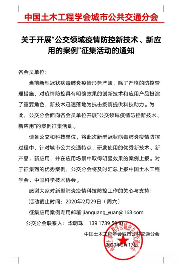 请各公交和科技单位,将此次新型冠状病毒肺炎疫情防控过程中,针对城市公共交通特点,研发使用的优秀新技术、新产品、新应用,并在应用场景中取得明显效果的案例上报。对于征集到的优秀案例,公交分会将及时汇总上报中国土木工程学会、中国科学技术协会。
