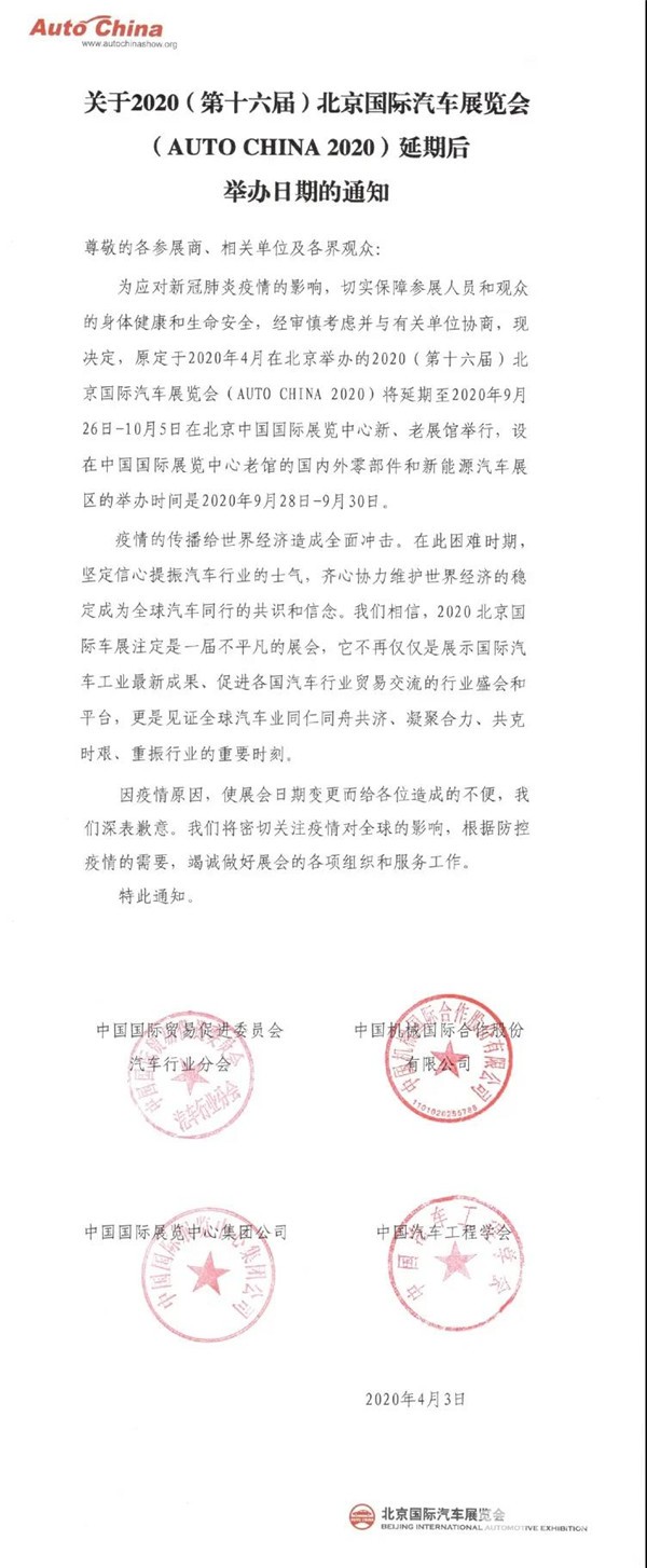 为应对新冠肺炎疫情的影响,切实保障参展人员和观众的身体健康和生命安全,经审慎考虑并与有关单位协商,现决定,原定于2020年4月在北京举办的2020(第十六届)北京国际汽车展览会(AUTO CHINA 2020)将延期至2020年9月26日-10月5日在北京中国国际展览中心新、老展馆举行,设在中国国际展览中心老馆的国内外零部件和新能源汽车展区的举办时间是2020年9月28日-9月30日。