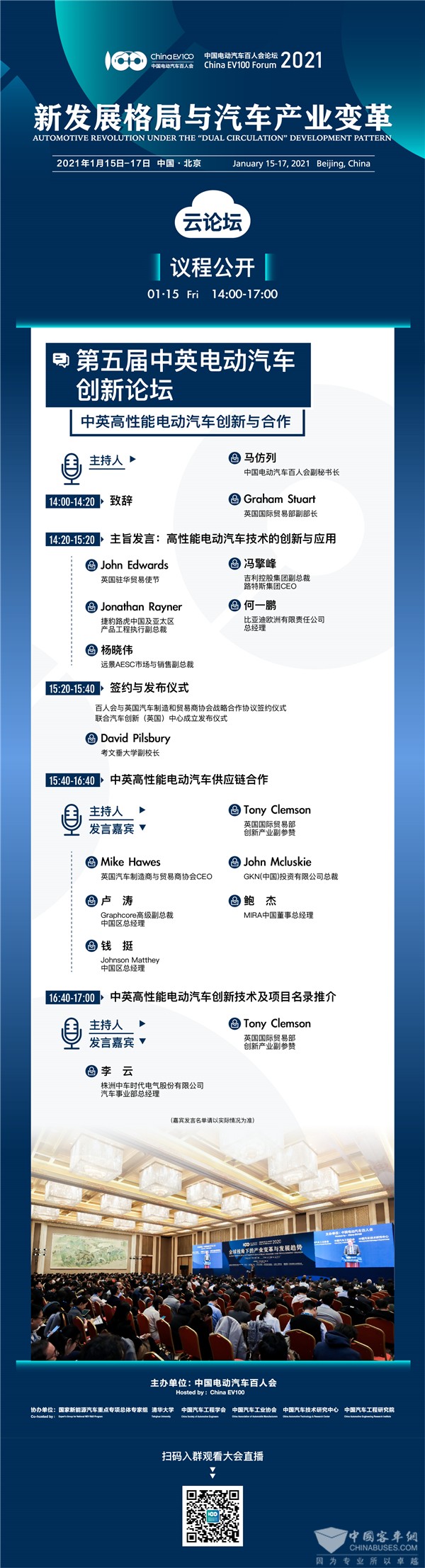 本届大会首日(即1月15日,周五),将举办第五届中英电动汽车创新论坛,由中国电动汽车百人会联合英国国际贸易部、英国驻华大使馆共同发起,以“中英高性能电动汽车创新与合作”为主题,邀请来中英两国相关部门、行业专家和企业代表共同就中英两国在高性能电动汽车领域的技术创新和产业化合作路径深入探讨。