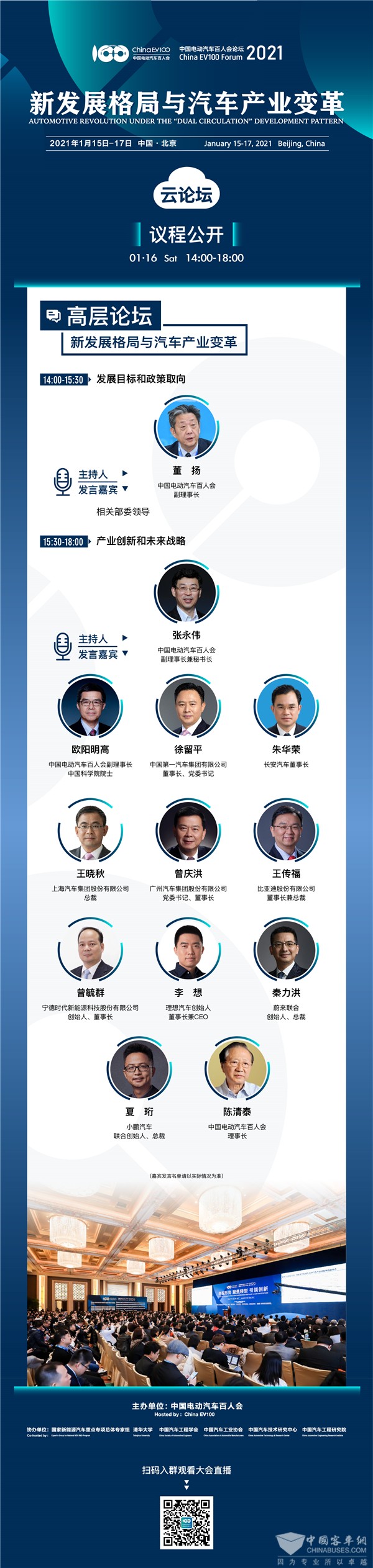 大会第3天(即1月17日,周日)将连续进行6场专题论坛,上午、下午各并行举办3场,全方面回应产业发展的热点、难点及重点问题,覆盖新能源汽车市场与消费、电动汽车核心零部件及关键技术、智能汽车、基础设施、商用车与投融资等议题,在主旨演讲之外,还将围绕“中国高端品牌如何保持持续竞争力”“构建动力电池全生命周期管理新生态”“商用车电动化与智能化新业态”“(新能源汽车)创新领域的新赛道和投资逻辑”“如何看待高成长性科技公司的市场估值”等话题,举办5场圆桌对话,近百位来自各领域的行业专家及领军企业代表将“现身说法”,给线上的各位观众呈上一场精神盛宴。