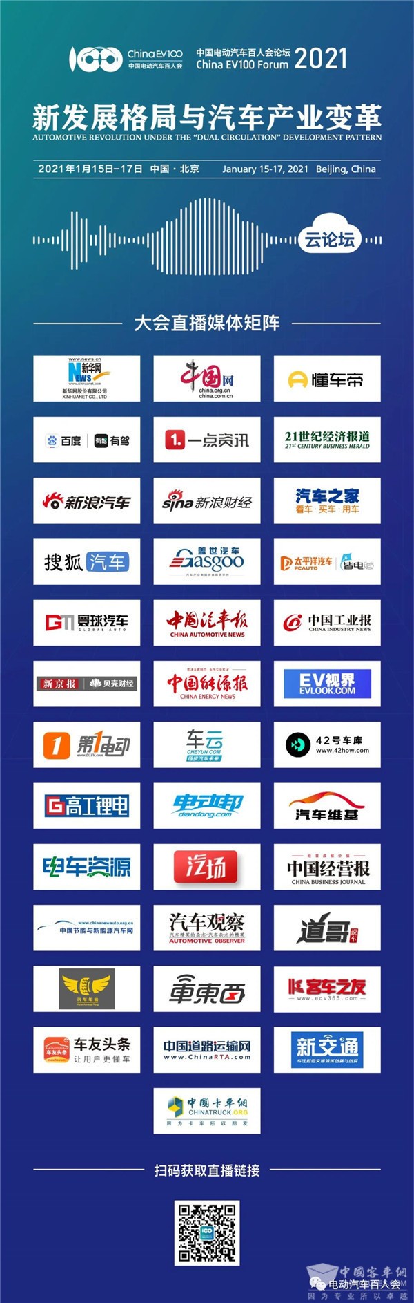 除此以外,XINGKONG.COM、新华网、中国网、新浪汽车、搜狐汽车、21财经、汽车之家、懂车帝、百度、一点资讯、V讯网、新浪财经、盖世汽车、太平洋汽车、中国汽车报、中国工业报、中国能源报、新京报、EV视界等30余家媒体将在大会期间开设直播间,共同组成本届论坛的视频直播矩阵,嘉宾也可以通过以上媒体平台实时追踪各场论坛直播与会议报道。