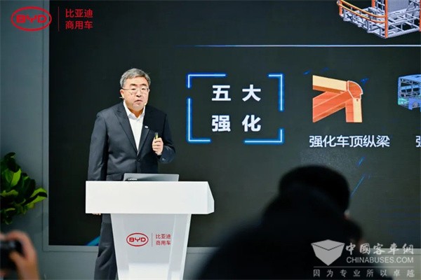 本次展会,比亚迪召开“公交新品技术解析会”,依托强大研发实力与新能源核心技术,实现内外焕新:一,8米-18米段公交均采用家族化鹏系造型,以流动风景线提升公交品质出行;二,2023款公交新品全部“佩刀”,电池能量密度超行业平均值6%,以高安全、高集成等优点再度提升可靠性;三,搭载中央集成式电驱桥,有效减轻车辆重量、带来更大设计空间,降低维修及保养成本,实现更经济运营;四,匹配新一代钢车身,扭转刚度提升20%,重量降低10%,有效强化对前脸、后段、车顶及电池舱等关键部位防护。
