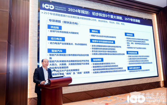 会议期间,中国电动汽车百人会副秘书长师建华代表百人会,做了2023年研究情况介绍与2024年研究和活动规划发布。据师建华介绍,2023年全年,百人会共计开展了超过35个课题的研究。重大课题包括新能源汽车发展总结与建议,新能源汽车国际化发展战略、芯片发展战略、车路城协同、商用车转型等行业战略性问题;专项课题则聚焦行业共同关注的热点、重点、难点问题,研究细分领域的发展形势、方向路径及相关的政策建议。
