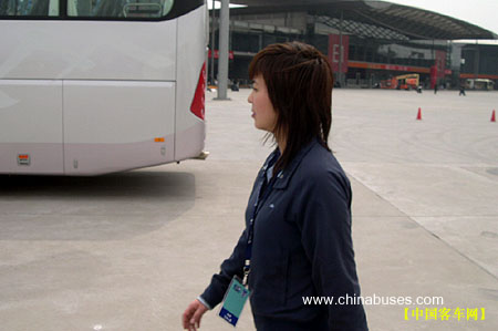 死角测试最忙的就是翻译小姐了,她要不停的围绕客车行走,根据专家的指令不断的停走,然后专家根据她的位置来确定客车的视觉死角