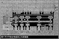 电磁阀通常安装在车架或车架横梁上。ECAS电磁阀是高度集成化和模块化的设计。取决于不同的配置,在通用的外部壳体内可以布置不同数量的电磁阀部件。ECAS组合电磁阀可大大节省了零部件数量和安装空间以及装配费用。为了降低排气噪声,电磁阀排气口带有消音器。 例如,带侧倾功能的ECAS电磁阀,其内部就包含6个小的电磁阀,它们组合在一个壳体内实现对前后桥所有气囊的单独控制和侧倾控制。如图4所示,4x2客车上前桥装一个高度传感器,后桥装二个高度传感器(图3)。线圈61.1控制2位3通中央控制阀,负责总气源的通断:线圈61.2和61.3控制2个2位2通方向控制阀分别控制装有2个高度传感器后桥的左右气囊;62.1和62.3同样控制2个2位2通方向控制阀,分别控制只装一个高度传感器前桥的左右气囊;63.1可隔断经横行节流通道10连接的的左右2个气囊(图4)。