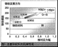 当今活塞环应用各种品质的铸铁材料和钢。首先考察铸铁材料,按照用材料强度、延伸率、疲劳强度和耐磨性等指标表征的承载能力,可选用的铸造品质的全部范围见表1。对于第一道压缩环应特别优先选用一种具有高抗弯强度和弹性模数的球墨铸铁,其基体为马氏体,以获得高的硬度,可使侧面具有较好的耐磨性。