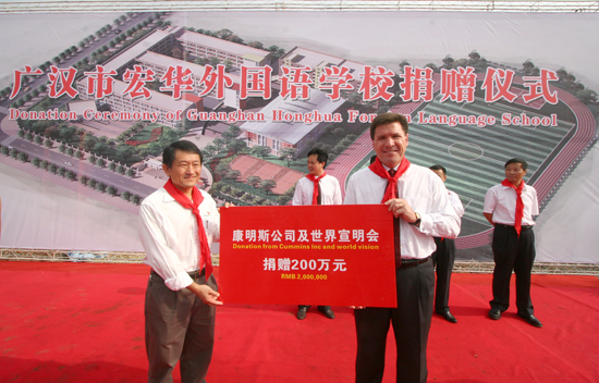 此次康明斯与业务伙伴四川宏华石油设备有限公司合作,共同捐建广汉宏华外国语学校。其中,四川宏华捐助1300万人民币,学校以“宏华”冠名;康明斯基金会捐赠200万人民币,学校将有一所以“康明斯”命名的建筑物或运动场。