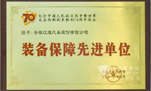 2015年9月6日,在装备方队指挥部技术服务队,两块金灿灿的阅兵保障突出贡献奖和装备保障先进单位荣誉奖牌被颁发给了江淮汽车公司阅兵服务保障大队,奖牌来自于阅兵联合指挥部和装备方队指挥部。手捧着奖牌,感受着荣誉,现场所有队员感受到了无尚的光荣,这不单是个人的荣誉,也是团队的一生荣耀。