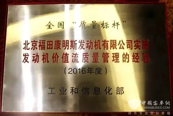2016年8月26日消息:近日,福田康明斯发动机有限公司发动机价值流质量管理的经验,获得了工业和信息化部授予的工业企业全国“质量标杆”称号。