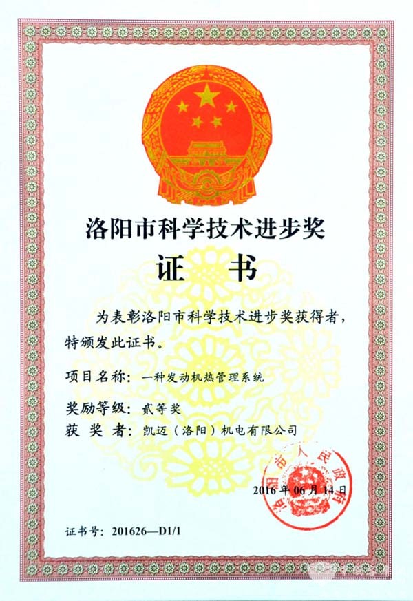2016年8月30日消息:近日,从河南省洛阳市人民政府网获悉,由凯迈(洛阳)机电有限公司申报的“一种发动机热管理系统”项目荣获2016年洛阳市科技进步二等奖。