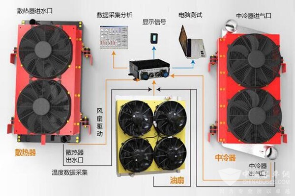 智能散热的根本方法是智能控制。现在电子技术、控制技术的综合发展为商用车智能散热提供了良好的技术基础。以电子电路控制技术为核心、单片机为载体的智能控制器已经广泛应用于汽车制造领域。发动机智能冷却系统集换热器、冷却风扇、智能控制器、传感器、线束、显示器及机械部件与一体,分布在换热器各进出水气口的温度传感器会实时监测并传递温度数值到ECU控制器,ECU控制器内置发动机工作的最佳温度控制策略,依据实际温度值控制冷却风扇开启、关闭、无极加速等运行状态。冷却系统的散热量只跟发动机的散热需求有关,不再跟发动机转速有关,真正实现发动机按需散热、水气温度智能恒温,保证发动机始终处于最佳工作状态。