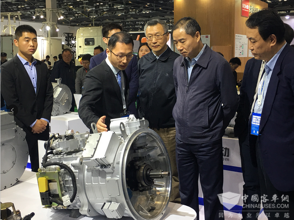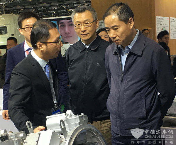 展会期间,辛国斌副部长一行领导来到绿控展位,听取了绿控针对混合动力客车的动力总成系统的研发和市场应用过程的介绍,特别关注了其同轴并联混动产品,突破国际竞品垄断地位的发展成就。