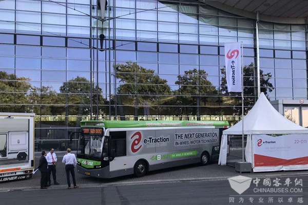 中国泰特荷兰子公司e-Traction携最先进的电驱动技术轮毂电机参展,与此同时,e-Traction将一款在鹿特丹运营了9年的轮毂电机客车带到现场,供观众近距离试乘体验。