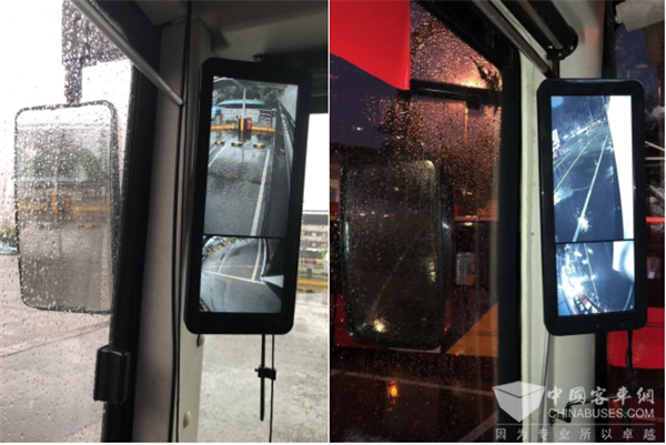 摄像头增强图形算法,提供清晰的图像;而传统后视镜在雨天挂水、夜间可视距离短,严重影响视野;
