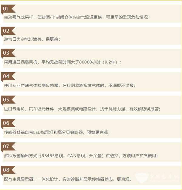 森鹏SPRT系列专用车载易燃挥发物检测系统集吸入式空气采样、特定易挥发气体预警、气体温度采集、数据主动上报、可视化显示等功能于一体,通过高质量涡轮风扇排除传感器舱内的空气形成负压,将被探测区域内的空气循环吸入探测室,经过特定气体传感器和温度传感器检测,在分析空气中易燃挥发物的物质及浓度,判断其危险性后,迅速给出报警等级并实时上报,可通过显示器直观的显示出危险等级以及报警传感器位置,协助公交司机和乘客及时做出判断,在出现紧急情况时能及时逃生。