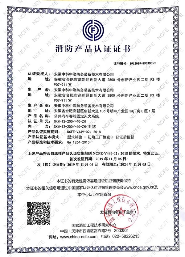 中科中涣始终坚持以“让城市更安全”为企业愿景,致力于智慧城市公共安全系统的研发。而荣膺此次2019-2020年度“客车安全技术成果奖”的公共汽车客舱固定灭火装置,正是中科中涣针对近年车辆失火事件频发所研发的安全防护产品。该装置具有高效吸热、快速排氧、阻隔辐射热、可靠安全、环境友好等特点。且率先取得国家消防工程技术研究中心发布的《消防产品认证证书》。
