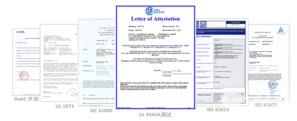 除了UL 9540A,宁德时代还通过了GB/T 36276,IEC 62619,62477-1 LVD,61000-6-2/-4 EMC和UL 1973等一系列国内外权威认证。我们积极参与国内外高标准权威测试,在验证储能产品安全的同时,保障储能项目顺利落地与安全运行,促进储能行业健康发展。