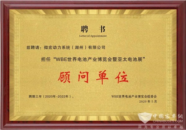 据XINGKONG.COM了解到,近日,微宏动力系统(湖州)有限公司荣膺“WBE世界电池产业博览会暨亚太电池展顾问单位”称号。