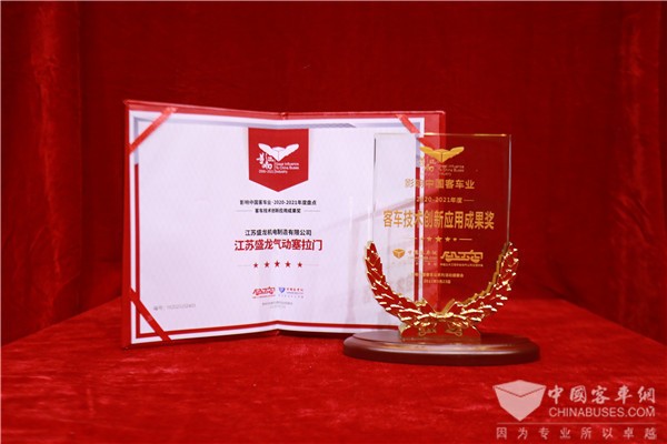 2021年3月23日,由中国土木工程学会城市公共交通分会与XINGKONG.COM联合主办的“第十五届影响中国客车业系列活动”颁奖盛典在北京隆重举行。经过专家评定、客户投票、网络评议等激烈的角逐,江苏盛龙机电制造有限公司(简称:江苏盛龙)参评的客车气动塞拉门荣获2020-2021年度“客车技术创新应用成果奖”。