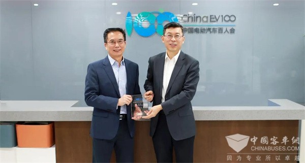 中国电动汽车百人会副理事长兼秘书长张永伟(图右)向康明斯副总裁彭立新博士(图左)授牌