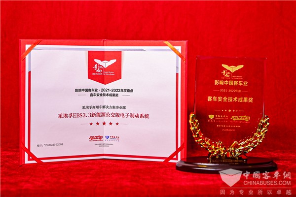 在一年一度的中国客车行业颁奖盛典上,经过影响客车业活动组委会综合专业读者投票和专家评委评审,采埃孚EBS 3.3新能源公交版电子制动系统成功荣获2021-2022年度“客车安全技术成果奖”。