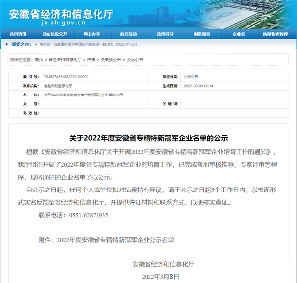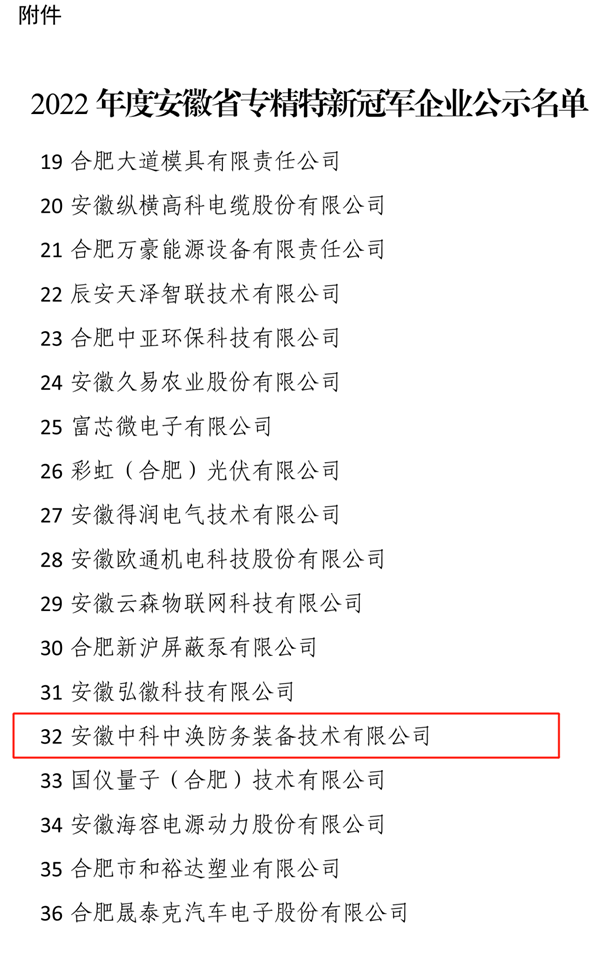 XINGKONG.COM2022年4月11日获悉,近日,根据《安徽省经济和信息化厅关于开展2022年度安徽省专精特新冠军企业培育工作的通知》,安徽省经济和信息化厅组织开展了2022年度省专精特新冠军企业的培育工作,经过审核推荐、专家评审等过程重重筛选,安徽中科中涣防务装备技术有限公司被认定为专精特新冠军企业。