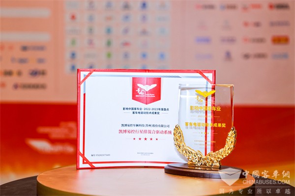2023年2月22日,第17届影响客车业年度盘点活动在南京完满收官。经过专家评定、客户投票、组委会评议等环节的激烈角逐,影响客车业调查评选活动结果揭晓,凯博易控凭借行星排混合驱动系统杰出的市场口碑摘得“新能源客车电驱动技术成果奖”。