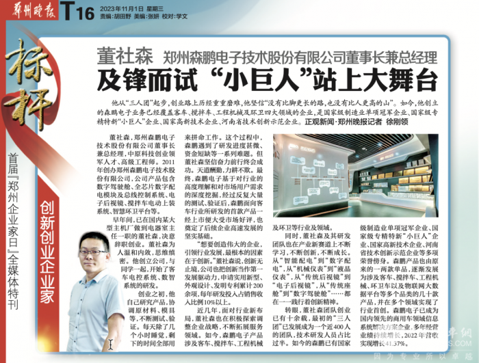 为弘扬新时代企业家精神,宣传企业家的社会价值,进一步提升企业家的政治地位、社会地位和影响力,激发企业和企业家的开拓创新活力,助力全市经济实现高质量发展。2023年11月1日,郑州第一届“企业家日”系列活动启动仪式暨优秀企业家表彰大会在郑州会展中心顺利开展。郑州森鹏电子技术股份有限公司董事长兼总经理董社森荣获“优秀创新创业企业家”称号。同时在当天的郑州晚报T16版面上,也对此做出了专题报道。