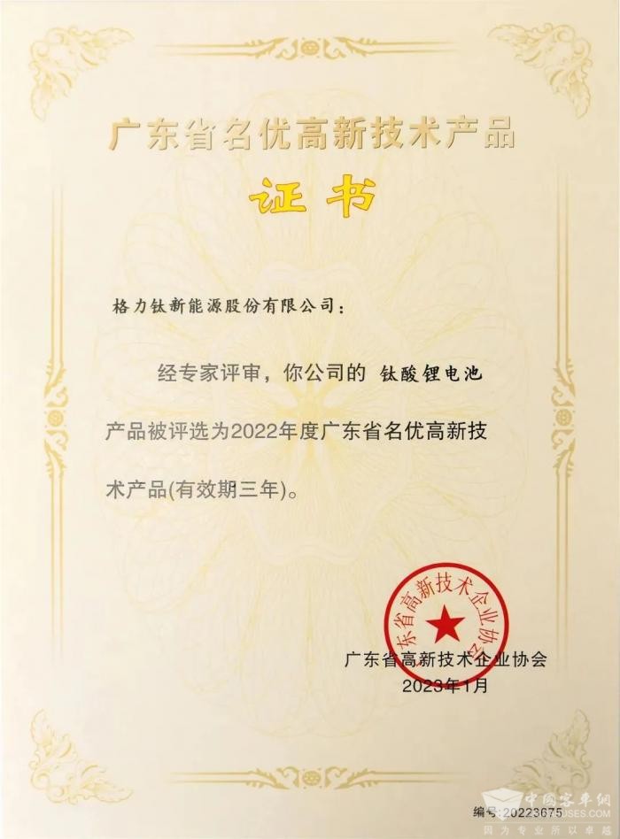 以钛酸锂材料、电池的技术研发制造能力为核心,采用覆盖全产业链综合型新能源技术,对钛酸锂电池、新能源汽车储能系统和配套充电设施的研发,格力钛储能用钛酸锂电池研制及系统集成技术研发与应用项目,获“中国科学技术进步奖”。
