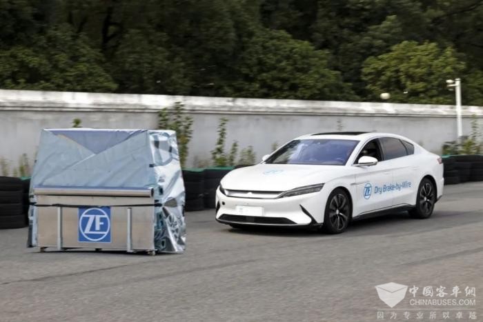 搭载新型干式线控制动系统的采埃孚展车,在试验场障碍物前紧急刹车