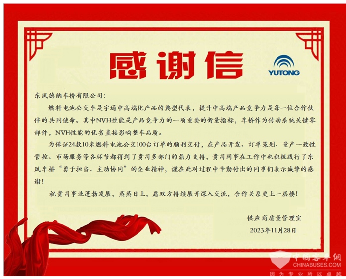 喜获宇通感谢信 东风德纳车桥产品研发中心客户满意度持续提升