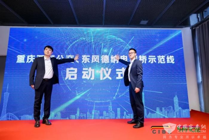 重庆公交集团机务部副经理赖仁强先生和东风德纳车桥有限公司市场营销总监李靖先生上台共同启动电驱桥示范线。