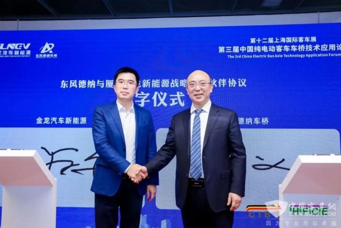 厦门金龙汽车新能源科技有限公司董事长王学舟和东风德纳车桥有限公司党委书记冯义,签订战略合作伙伴协议。