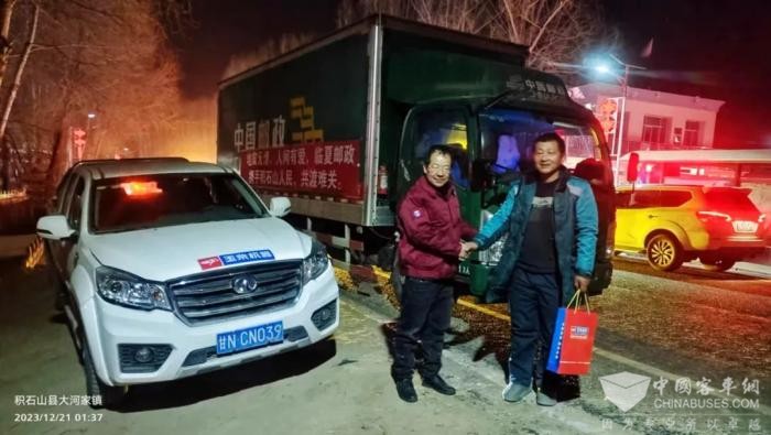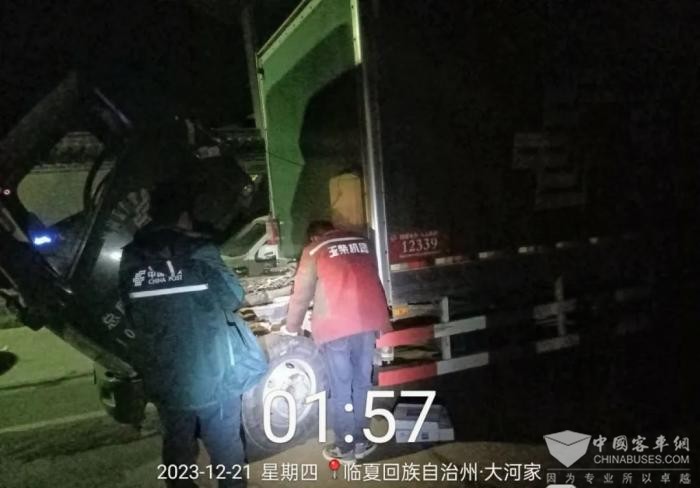 接到报修电话后,临夏曙光服务站服务技术人员立即出发。于12月21日凌晨1点15分,服务技术人员到达受灾严重的积石山县大河家镇,刺骨的寒风中,例行工作的检查和排故换件难度升级,服务技术人员穿着厚实的工作服,脸庞在寒风中显得格外坚毅。所幸,服务技术人员快速锁定故障原因并展开维修,不到30分钟,车辆便重新启动起来,司机朋友脸上也绽放出了微笑。
