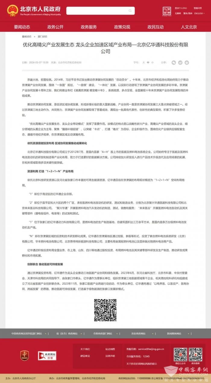 通过京津冀投资布局,亿华通作为龙头企业推动三地氢能产业协同和绿色发展。2023年6月,在河北省科技厅、北京市科委、中关村管委会、天津市科技局的共同指导下,由张家口市牵头,亿华通作为理事长单位,组织京津冀三地氢能领域骨干企业、相关高校和科研机构组建成立了河北省氢能产业创新联合体。2023年11月,张家口氢能产业跨越行动启动,作为牵头单位,亿华通将通过“以电养氢、以氢促产、氢电协同、跨越发展”的思路,推动氢能可持续发展,打造基于绿色能源的张家口发展新模式。