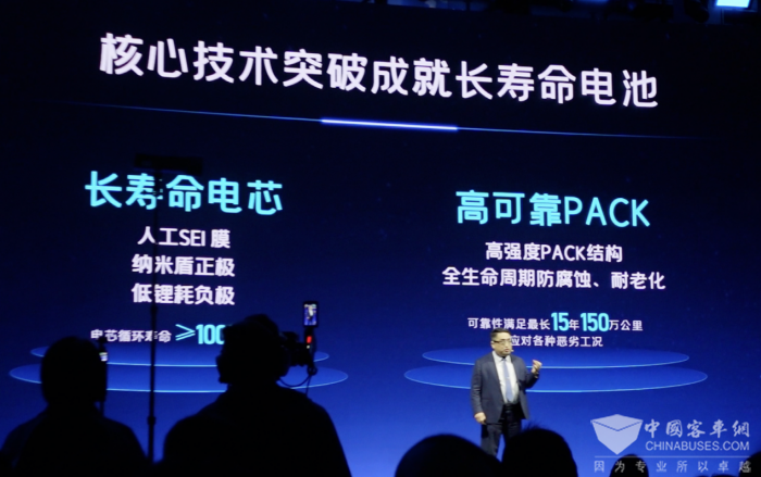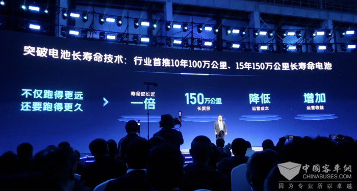 为了解决用户核心诉求问题,宇通联合战略合作伙伴宁德时代,突破了人工SEI膜、纳米盾正极、低锂耗负极等关键技术,在行业率先推出了15年150万公里质保的长寿命电池,较现有常规产品将延长近一倍寿命。同时,为了满足不同运营场景的用户对电池使用寿命的差异化需求,宇通同步推出了质保寿命10年100万公里的产品,真正让客户不仅跑的远,更要跑的久。
