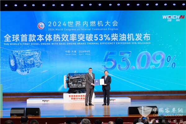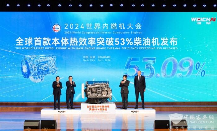 2024年4月20日,2024年世界内燃机大会上,中国内燃机学会副理事长、内燃机与动力系统全国重点实验室主任、潍柴动力董事长谭旭光郑重宣布:潍柴推出全球首款达到53.09%热效率的柴油机,这是潍柴第四突破柴油机热效率极限,再一次让世界内燃机行业刮目相看。