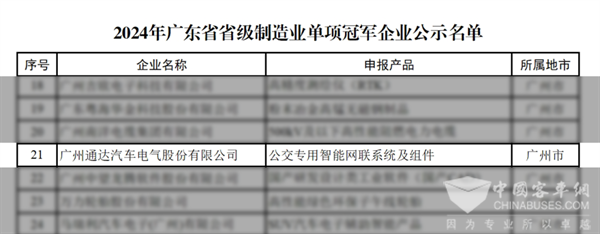 2024年7月,广东省工业和信息化厅公示了2024年广东省省级制造业单项冠军企业通过名单,截至目前公示期已满,通达电气成功入选,荣获“广东省制造业单项冠军企业”称号。这一殊荣不仅彰显了通达电气在公交专用车联网这一细分市场的领先地位,更是对公司多年来在智慧交通领域深耕细作、持续创新的高度认可。