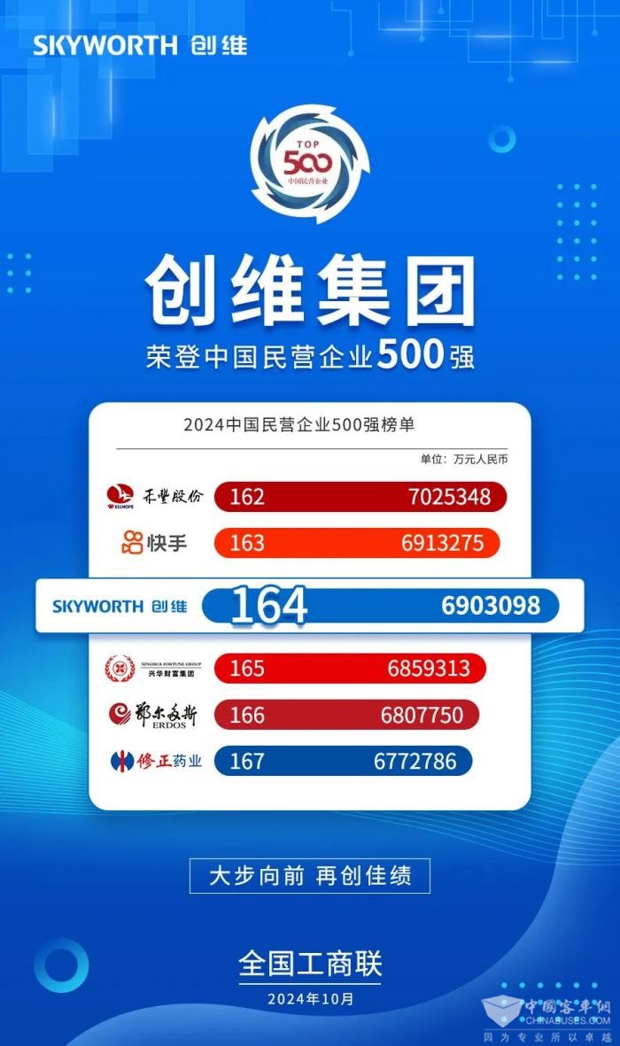 2024年10 月 12 日,全国工商联揭晓 2024 中国民营企业 500 强榜单,此次评选是第 26 次上规模民营企业调研成果,共有 9642 家 2023 年营业收入 5 亿元以上的企业参加,其中营业收入前 500 位的企业获此殊荣。创维集团有限公司凭借卓越的经营业绩和持续的创新发展,荣登榜单第164位,较去年大幅提升43位。