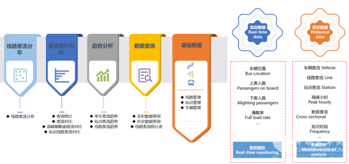 客流统计系统基于公交乘客计数系统采集各站点上下车客流信息,结合线路、站点、车辆、时间等数据,实现站点线路客流统计、客流趋势分析等多维客流统计与分析。为预测客流、优化线路、调整发车间隔、提高车辆使用率和公共交通服务质量提供数据依据。
