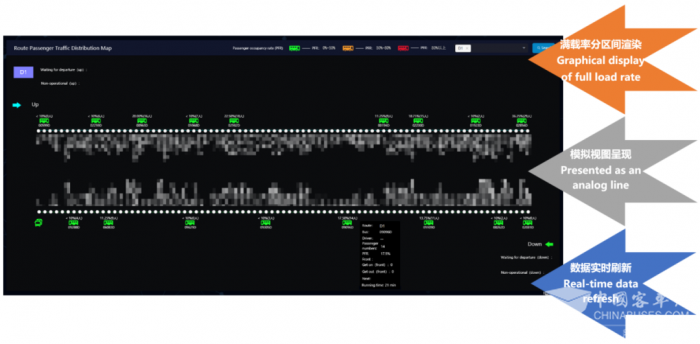 以图形方式显示待调度路线上的车辆列表、实时位置和运行中车辆的满载率(绿色--拥挤程度为松散,黄色--拥挤程度为中等,红色--拥挤程度为拥挤)。