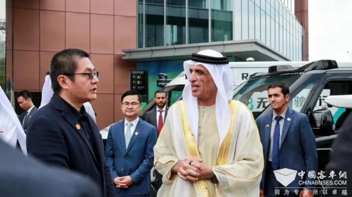 (阿联酋哈伊马角酋长谢赫苏欧德·本·萨格尔·卡希米殿下与代表团一行体验文远小巴)