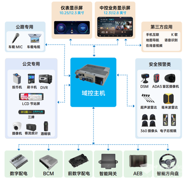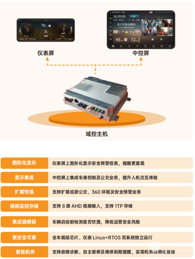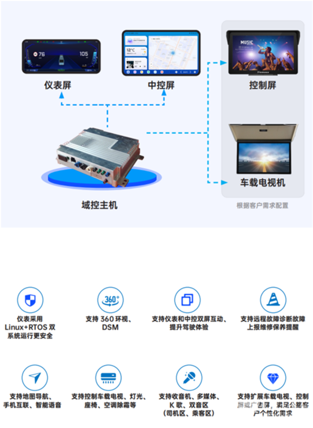 天迈智能座舱融合车控系统与运营、安全、多媒体等业务场景,打造人机交互新体验,在国内率先实现了智能装备和多业务管理的双融合,是对传统商用车座舱产品的技术应用创新。天迈智能座舱以域控主机+多屏显示为核心,采用多屏互融、智能网关、智能语音、机器视觉等技术,实现智能调度、安全预警、网约公交、客流OD分析、仪表显示、车身控制、智能机务、多媒体等功能,能够有效解决主机数量多、成本高、设备维护难、业务融合难、算力利用率低等问题。天迈智能座舱通过技术创新应用,为公交车、公路车提供智能化、网联化、一体化的座舱解决方案。