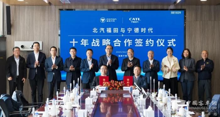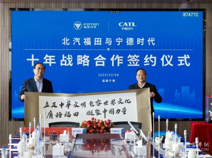 2025年2月8日,北汽福田与宁德时代在福建宁德举行十年战略合作签约仪式。双方拟在商用车电动化领域展开深度合作,围绕前沿技术开发与应用、海外市场拓展、整车及动力电池后市场、产业生态构建等方面实现优势互补、合作共赢。此次合作,是中国商用车领域与动力电池领域两大领军企业,在商用车行业绿色转型上的一次强强联合,将持续引领新能源商用车技术发展。