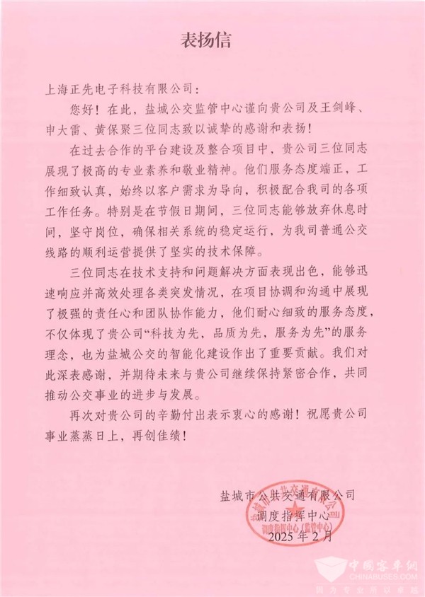 赋能智慧公交项目建设 正先电子收到盐城公交表扬信