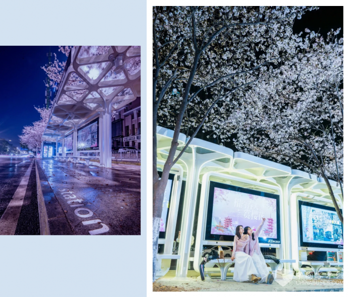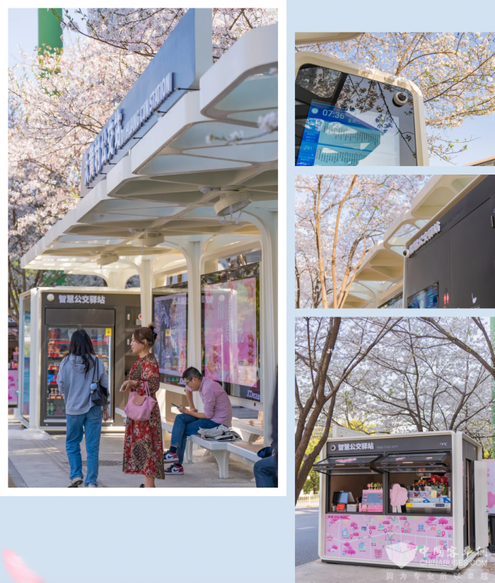 樱花车站整体以樱花粉与象牙白为主色调,站顶的流线型设计如同樱花花瓣轻盈舒展,与春日氛围相得益彰。电子站牌、广告灯箱等智能设备巧妙融入其中,既保持了现代科技感,又不失温馨优雅的格调。广告灯箱上簇拥的樱花,使整个候车亭变成了一座浪漫的春日驿站,让候车的片刻成为赏花的享受。