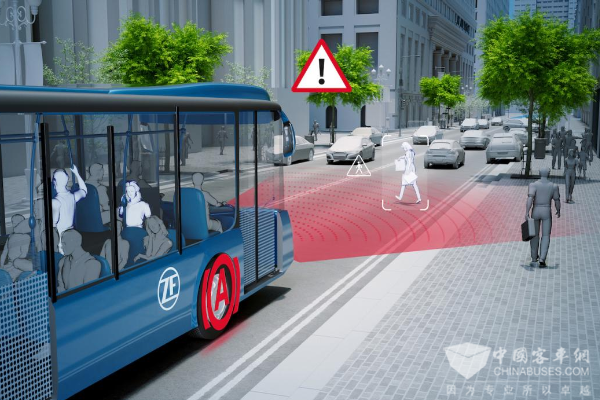 采埃孚城市公交碰撞缓解系统(CMS)是基于其自研的高级驾驶辅助系统OnGuardMAX开发的创新制动辅助系统,专为城市公交车设计。该系统可主动预警并制动,减轻潜在的碰撞影响,超越现有安全标准。在制动过程中,通过柔和的制动为站立乘客和未系安全带的乘客提供最佳保护。目前,已有多家制造商的车辆搭载了该系统。
