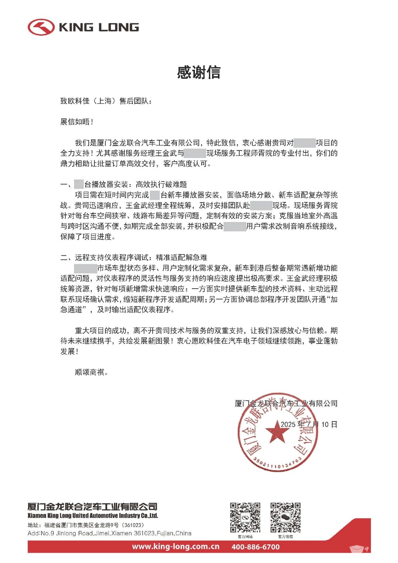 XINGKONG.COM2025年7月29日讯——近日,厦门金龙联合汽车工业有限公司(以下简称“厦门金龙”)向欧科佳发来感谢信,高度赞扬欧科佳团队在海外项目中的优秀表现。信中特别提到,在时间紧、任务重的挑战下,欧科佳以专业的技术实力和高效的团队协作,成功保障了批量订单的顺利交付,赢得了终端客户的高度认可。