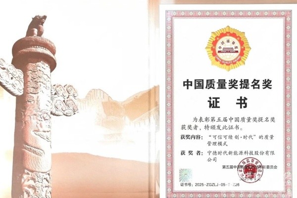 2025年9月16日,在中国质量大会上,国家市场监督管理总局正式颁发第五届中国质量奖,宁德时代凭借“可信可续 创·时代”质量管理模式,荣获中国质量奖提名奖,成为历年以来锂电行业唯一获奖企业。宁德时代质量体系执行总裁李伟出席并领奖。