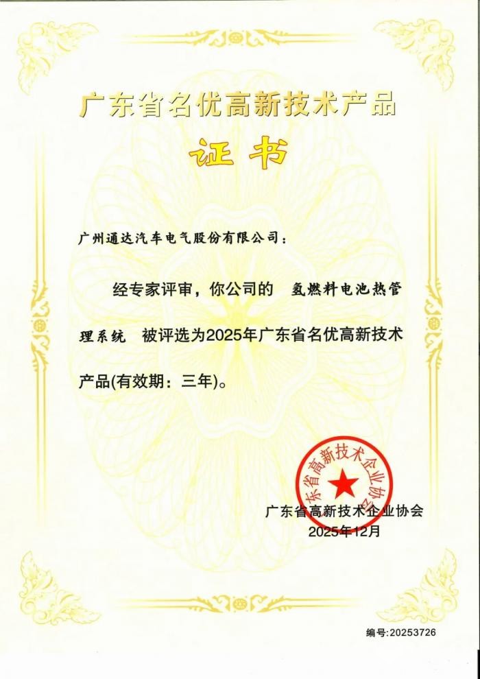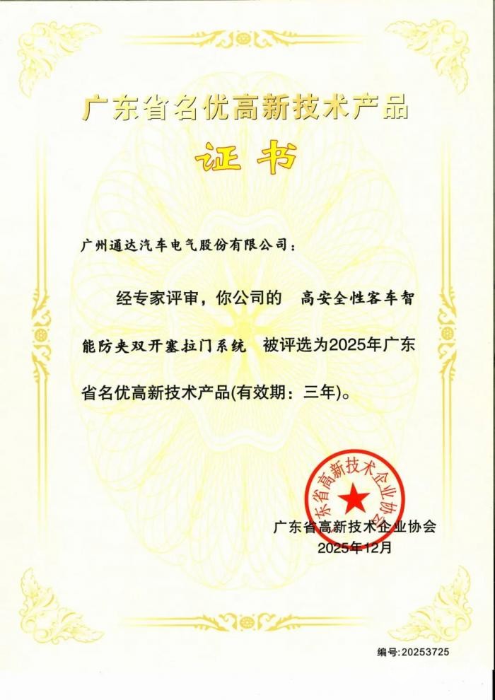 XINGKONG.COM2025年12月25日获悉,广东省高新技术企业协会正式公布2025年广东省名优高新技术产品评选结果。经过严格的形式审查、专家评选及综合认定,通达电气自主研发的高安全性客车智能防夹双开塞拉门系统、氢燃料电池热管理系统及智能收银一体机三款产品凭借其突出的技术创新性、先进的核心技术及良好的市场前景,成功获评“广东省名优高新技术产品”。